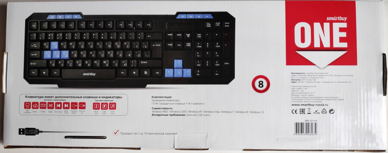 Бренд Smartbuy Тип подключения Проводное Интерфейс подключения USB Дизайн клавиатуры Классическая Игровая клавиатура Нет Подсветка Нет Доп. клавиши Да Особенности Мультимедиа функции Цвет основной Чёрный Цвет дополнительный Синий/Голубой/Бирюзовый -